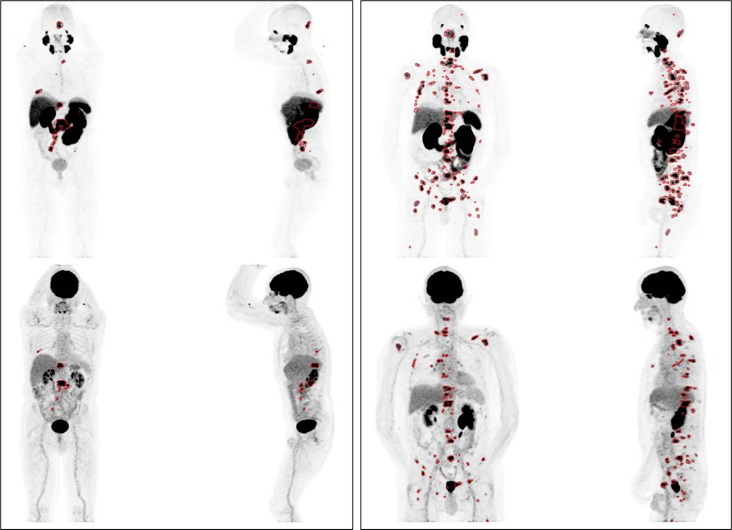 All cases will have some presence of disease for contouring but there will be a distribution of large- and small-volume cases and various patterns of metastatic spread (eg largely osseous, nodal, liver-involvement, etc). We have considered a balance of training and test cases that will account for a similar distribution of case patterns based on manual selection.